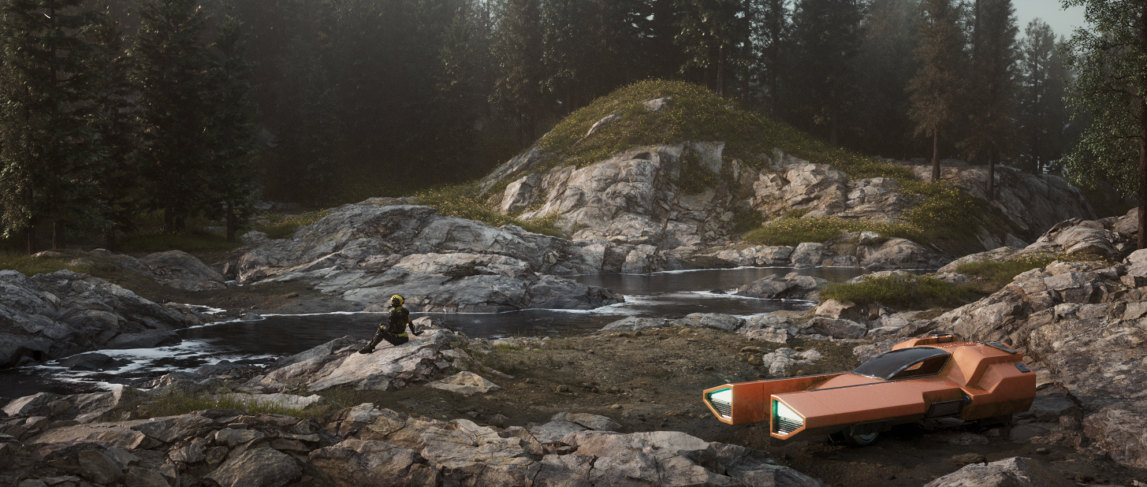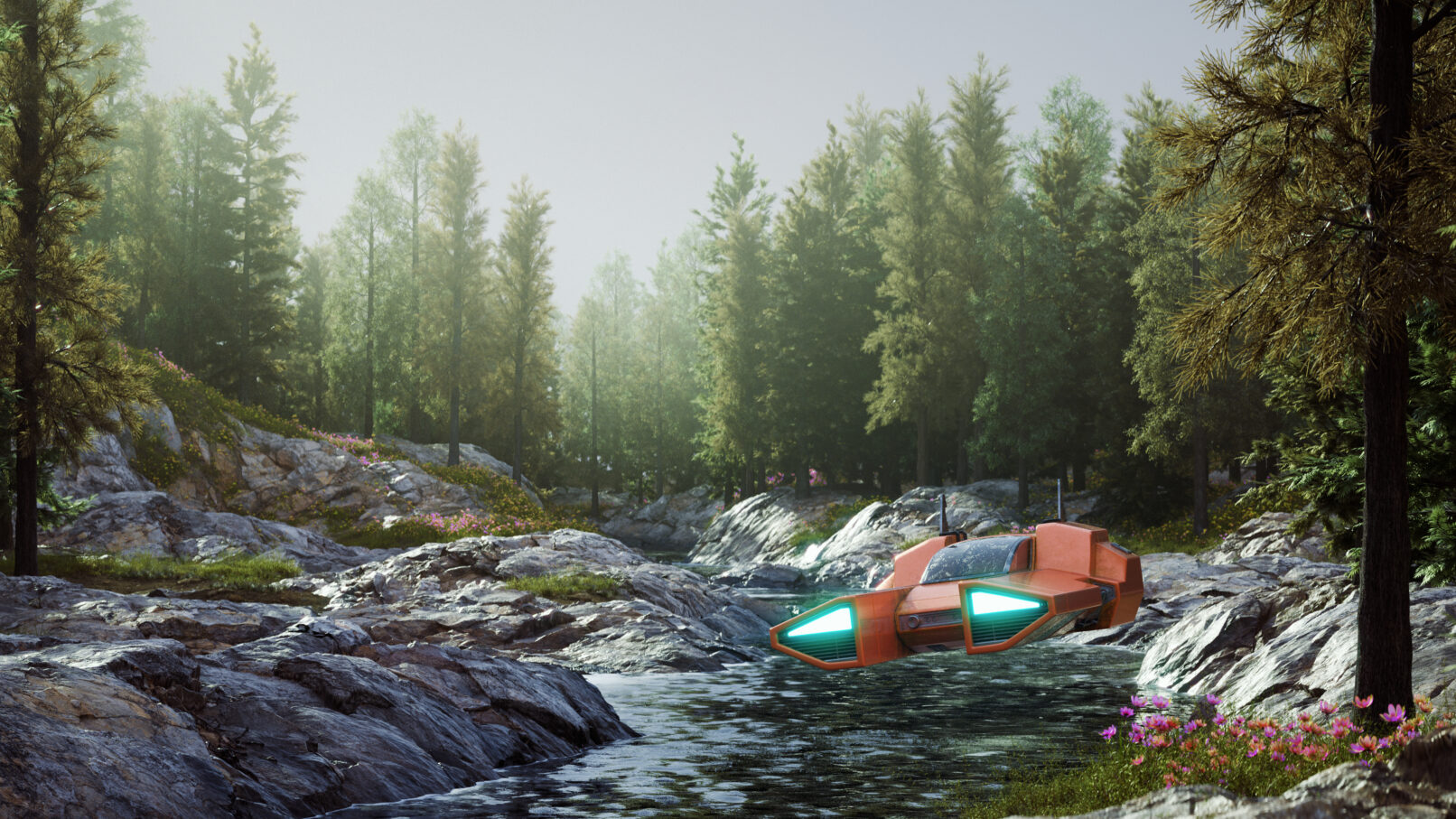 The scene is rendered using Octane and harnessing the power of the gpu renderer’s scatter tool to distribute trees, plants and other foliage across the scene. C4D’s field system is used to control and shape the areas where these objects get scattered. The trees and flower themselves are generated with the use of the Forester plug-in, which allows a lot of user-control for controlling various parameters of a plant. This includes, stem / trunk height, radius and bending, multiple controls for branches, stems, grass, leaves, petals, and so on, as well as seed randomizations to create wholly unique versions of the same plant.