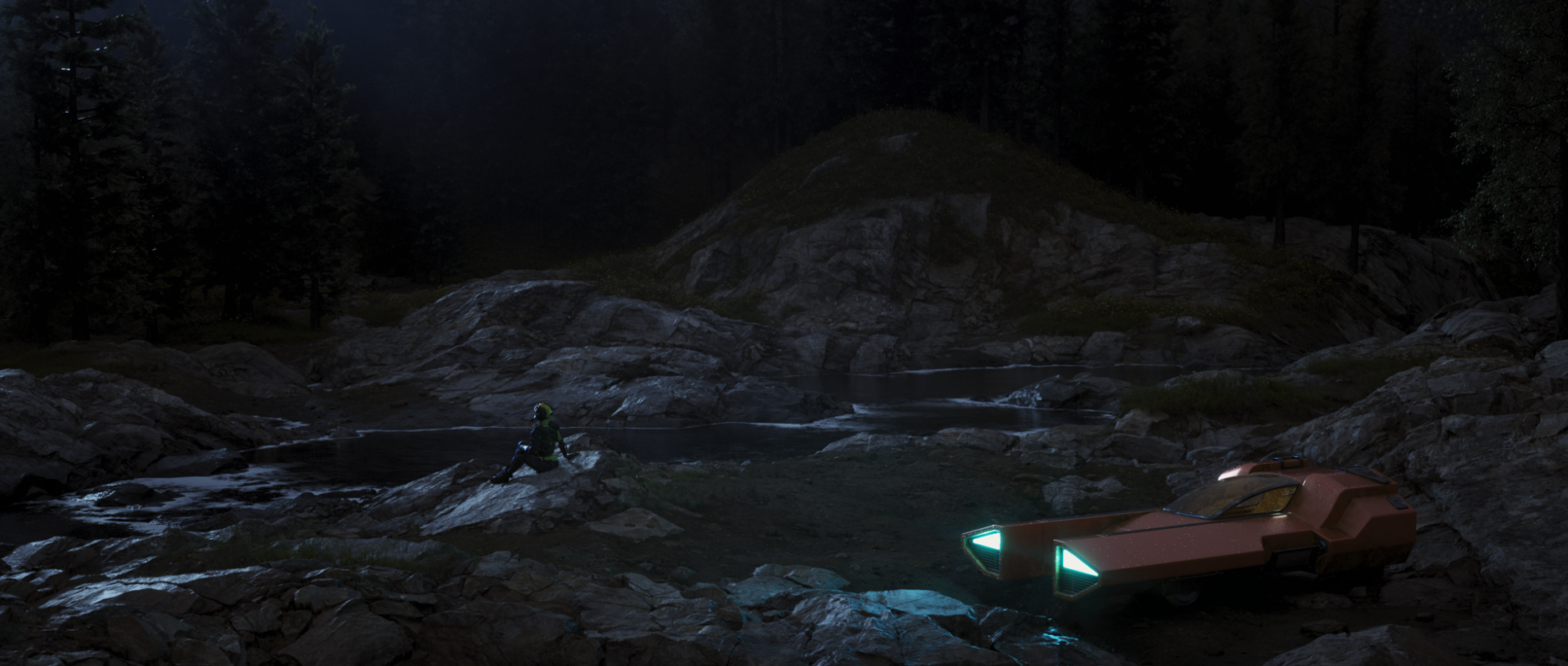 The material / textures of the plants right out of the box do not have the most photoreal look, as they are often too saturated and far greener than what is often found in nature. I had been going on hikes with the family fairly regularly at this time and used to opportunity to take a lot of photographs as reference. I learned a lot about the transparency present in a lot of leaves and petals, as well as the varying specularity / reflectivity plants, trees and rocks.